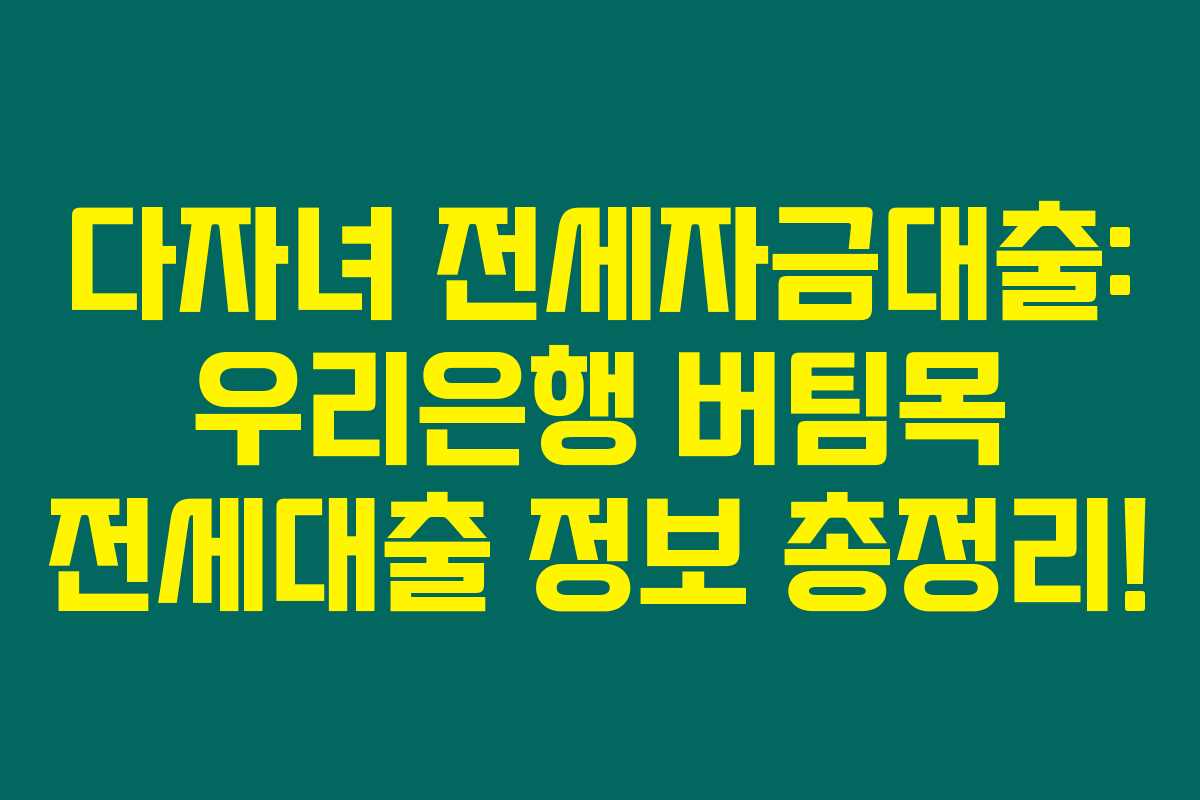제가 알아본 바로는, 다자녀 전세자금대출이 최근에 많은 관심과 주목을 받고 있는데요. 특히 우리은행 버팀목 전세자금대출은 정부에서 제공하는 다양한 지원 프로그램과 결합하여 혜택을 제공하고 있어요. 이 글에서는 신청자격, 대출한도, 금리, 중도상환수수료 등의 중요한 정보를 상세히 알려드리겠습니다. 아래를 읽어보시면 다자녀 전세자금대출에 대해 더 많은 정보를 얻으실 수 있어요!
