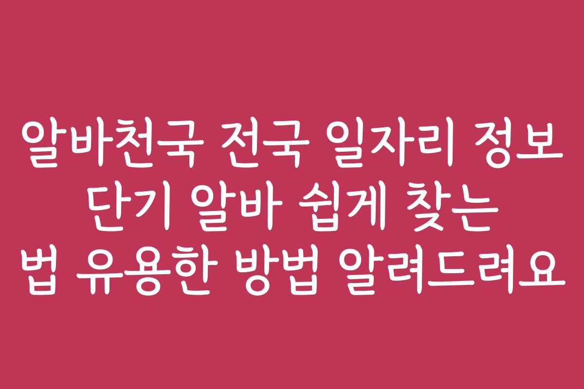 단기 알바를 찾는 일이 만만치 않습니다. 수많은 정보 속에서 내게 맞는 알바를 찾는 것이 어려울 수 있기 때문입니다. 이번 포스팅에서는 ‘알바천국’을 활용하여 전국 일자리 정보를 쉽게 찾아보는 유용한 방법들을 알려드리겠습니다.