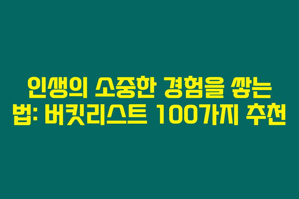 제가 직접 경험해본 결과로는, 인생에 있어서 목표를 세우고 그 목표들을 버킷리스트 형태로 정리하는 것은 굉장히 의미 있는 일입니다. 이에 따라 제가 알아본 바로는 여러분의 꿈과 소망을 이루기 위한 100가지 버킷리스트 예시를 준비했어요. 아래를 읽어보시면 당신만의 특별한 버킷리스트를 만들 수 있는 영감을 얻는 데 도움이 될 것입니다.